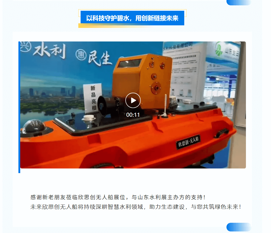 5月15日至5月17日,3天盛会,100+行业伙伴齐聚济南!欣思创无人船在山东国际会展中心与水利行业众多专家及同行共探水利生态新未来!(图片、视频来源欣思创无人船公众号)