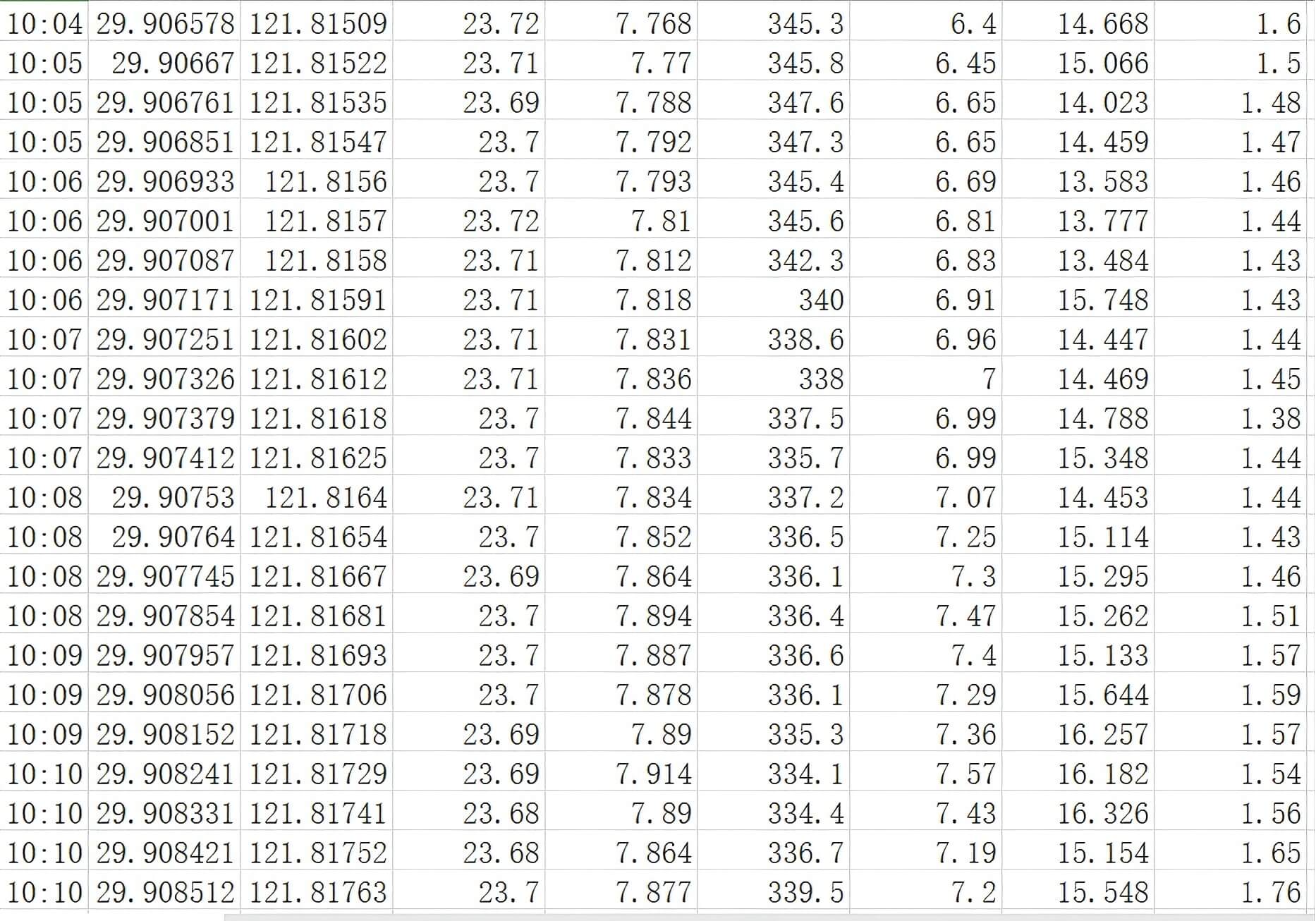 时间 | 纬度 | 经度 | 温度 | Ph | 电导率 | 溶解氧 | 浊度 | 氨氮 |